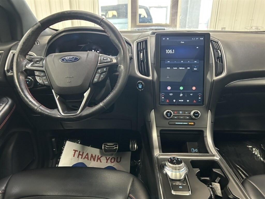 Panoramic Sunroof, Heated Steering Wheel, Heated Seats, Level up to our 2022 Ford Edge ST-Line AWD that`s built with a bold design in Agate Black! Powered by a TurboCharged 2.0 Liter EcoBoost 4 Cylinder serving up 250hp connected to an 8 Speed Automatic transmission that supports your adventures with spirited performance. You`ll also love the responsive handling of this All Wheel Drive SUV that returns nearly 28mpg on the highway. Turn heads as you go with exclusive badging, LED lighting, fog lamps, dual exhaust outlets, a rear spoiler, a power liftgate, 20-inch premium painted wheels, and heated power mirrors with approach lamps. Slide inside our comfortable ST-Line cabin that greets you with a panoramic sunroof, ActiveX heated power front seats with Miko inserts and red stitching, an EasyFold second row, a red-stitched leather-wrapped heated steering wheel, dual-zone automatic climate control, Intelligent Access, pushbutton ignition, and remote start. Intelligent SYNC technology is at your service with a 12-inch touchscreen, Android Auto®/Apple CarPlay®, WiFi compatibility, Bluetooth®, wireless charging, and a six-speaker sound system. Your world awaits! First-class Ford safety measures help you stay out of harm`s way with a backup camera, a blind-spot monitor, lane-keeping assistance, ABS, stability/traction control, and advanced airbags with Safety Canopy side-curtain coverage. Own our Edge ST-Line and stop sacrificing style for substance! Save this Page and Call for Availability. We Know You Will Enjoy Your Test Drive Towards Ownership!